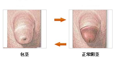 包皮过长指包皮覆盖了全部龟头,但勃起时可露出尿道口和阴茎头;包茎则是指包皮口狭窄或包皮与阴茎头部粘连,致使包皮不能上翻,尿道口、阴茎头不能外露的现象。